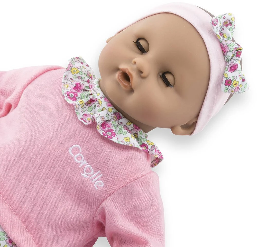 BĂ©bĂ© Calin Maria est un petit poupon de 30 cm; la taille parfaitement adaptĂ©e aux petits bras et mains de l’enfant pour le manipuler. Son corps souple lui permet de prendre les mĂŞmes positions qu’un vrai bĂ©bĂ©. Son visage; ses bras et ses jambes; Ă la dĂ©licate senteur de vanille; sont en vinyle doux au toucher. Son pouce peut se maintenir dans sa bouche comme un vrai bĂ©bĂ©. Avec ses yeux marron dormeurs; il fait dodo quand on le couche sur le dos. Il est habillĂ© d’une tenue 2-en-1 composĂ©e d’un pantalon fleuri et d’un T-Shirt rose manches longues et coiffĂ© d’un bandeau assorti. BĂ©bĂ© Calin Maria dispose d’une collection variĂ©e de vĂŞtements et d’accessoires dans la gamme mon premier poupon Corolle pour pouponner pour la première fois.