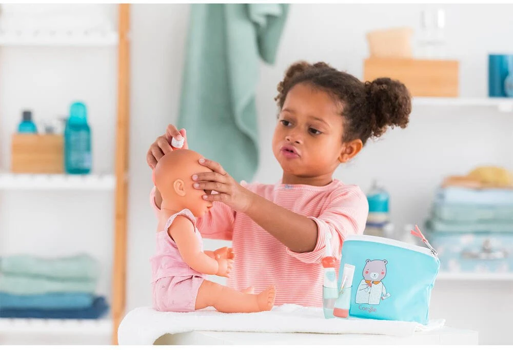 Avec la Trousse de Toilette et ses accessoires; l’enfant dispose de tout ce qu’il faut pour rĂ©aliser la toilette de son grand poupon de 36 Ă 42 cm et intĂ©grer le rituel du brossage de dents : un lait de toilette; un tube de dentifrice; une brosse Ă dents Ă©lectrique factice; un verre; ainsi qu’une jolie trousse de toilette pour tout ranger.