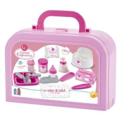 Une petite valisette remplie d’accessoires pour prendre soin de sa poupée. Le set comprend un pot, un assiette, 2 couverts, un paquet de couches factices, une boîte factice de lingettes, une boîte de talc, un peigne, un thermomètre, un distributeur de savon liquide, un chauffe biberon, un biberon et un verre avec bec verseur.