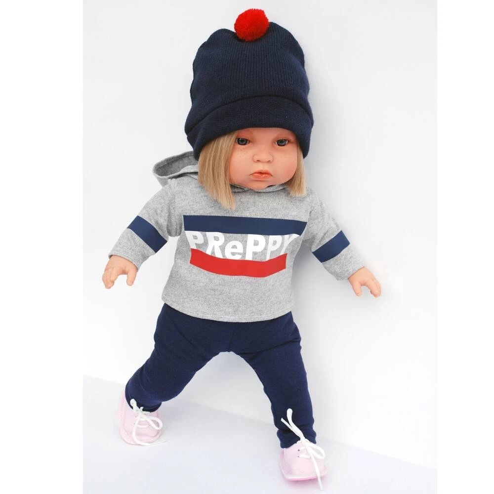 PoupĂ©e de 45 cm, au corps souple avec des parties en vinyle. Habits très tendance. Avec un bonnet, un pull imprimĂ© avec capuche, un pantalon et des chaussures. VĂŞtements : laver Ă la main sĂ©parĂ©ment, sĂ©chage Ă l’air libre, ne pas repasser.