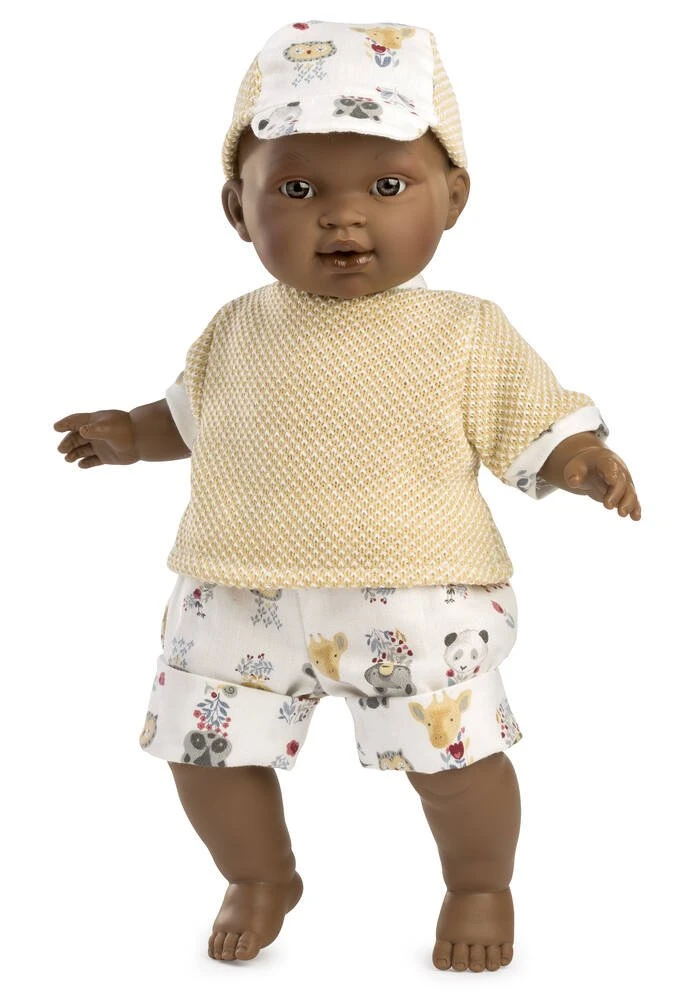 Poupon de 38 cm au corps souple rembourrĂ©. Il porte des habits d’Ă©tĂ© : un short, un pull lĂ©ger et une casquette. Les cheveux sont gravĂ©s. Matières des vĂŞtements : 100% polyester. VĂŞtements : lavage Ă la main prĂ©conisĂ©.