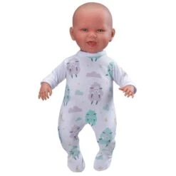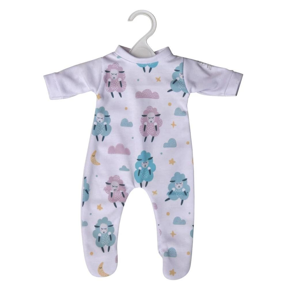 Habit pour poupée. Pyjama avec motifs moutons. Compatible avec les poupées de 42 cm. Tissu dont les fibres sont à 100% issues du recyclage de déchets plastiques récupérés dans les mers et les océans. Gamme : One World One future. Matière : 100 % en polyester recyclé. Séchage à l’air libre. Ne pas repasser. Le carton de l’emballage est fabriqué à partir de canne à sucre, 100% biodégradable. Le cintre et le sac en plastique de l’emballage sont en plastique recyclé et recyclable (non issu de déchets marins). Gamme de vêtements 100% fabriquée à partir de bouteilles plastiques récupérées dans les océans.