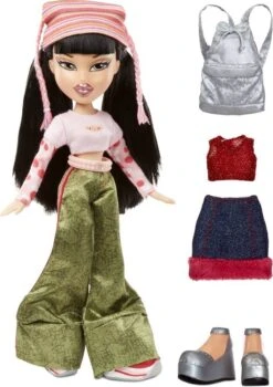 Si la passion de Poupée Bratz Yasmin sont les vêtements bohèmes avec des broderies, il en va autrement pour Jade. En effet, cette Bratz brune aime porter des pantalons de skater avec des pulls courts avec un motif tout mignon. Pour être la reine de la soirée, elle aime porter des vêtements à paillettes. Dans le set de Jade, on trouve des accessoires trop fashion, avec son sac et ses chaussures argentées, son bonnet péruvien et ses baskets compensées roses. Une brosse à cheveux est aussi fournie pour lui faire des coiffures trop sympas.