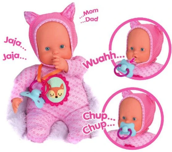 Nenuco 5 fonctions est un poupon au corps souple. Il a un pyjama rose tout mignon avec des oreilles de chats!