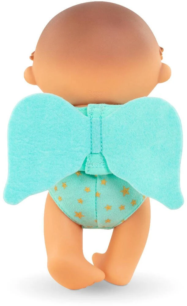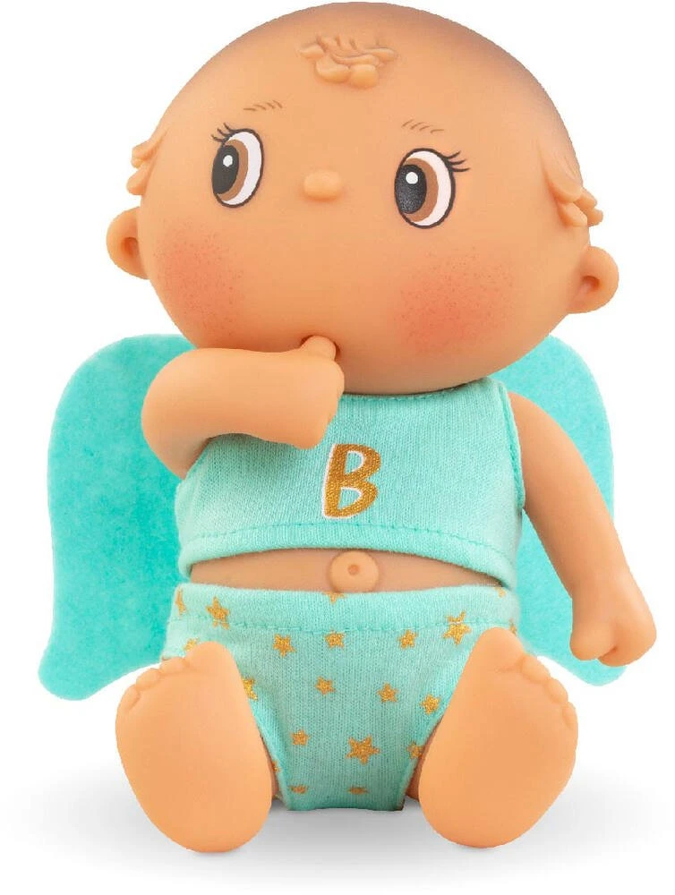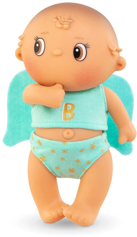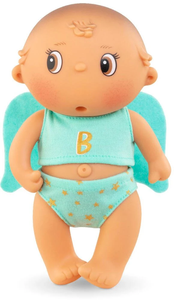 Mini poupon polisson de 20 cm. Les Beedibies ont un corps vinyle et des yeux peints. Comment ne pas être séduit par leur regard en coin ? Ils sucent leur pouce. Leur petit nombril proéminet est très rigolo ! Beedibies Gaspard est habillé tel un ange; avec de belles ailes vertes (non amovibles) dans le dos. Il arbore fièrement un B doré sur le devant de son t-shirt vert et porte une culotte assortie verte avec des étoiles dorées. Tous les Beedibies ont une délicate senteur de vanille. 3 modèles à collectionner. Dès 3 ans.