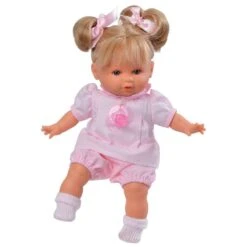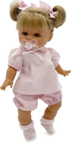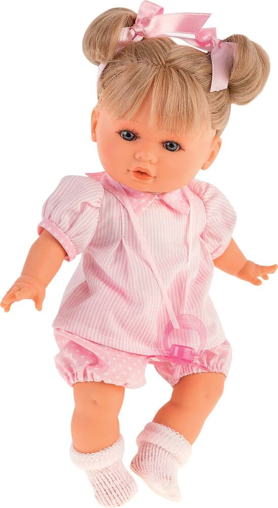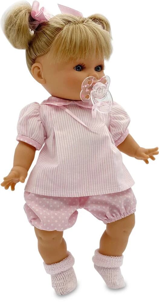 Poupée Cerisette, au corps souple de 30 cm (sans fonction). Blonde avec des couettes. Avec 1 sucette, 1 short, 1 tee-shirt, des petits chaussons et 2 rubans dans les cheveux.