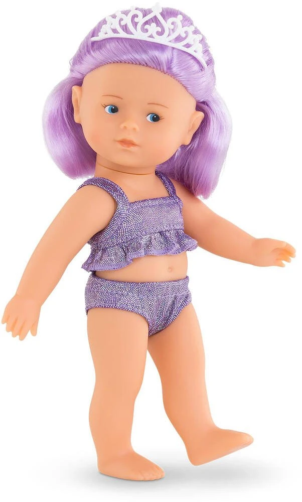 Mini Sirène Naya est une petite poupĂ©e de 20cm « prĂŞte Ă offrir ». Elle est habillĂ©e d’un maillot de bain deux pièces scintillant et est coiffĂ©e d’un diadème. Pour la transformer en sirène : rien de plus simple ! Il suffit de clipser sa demi-queue sur ses jambes. Elle a un corps tout en vinyle doux au toucher et Ă la dĂ©licate senteur de vanille. Ses yeux bleus sont peints. Elle a des cheveux mauve. Cette petite poupĂ©e nomade, compagne de baignade, se glisse aussi facilement dans un sac ou dans un cartable pour accompagner votre enfant tout au long de la journĂ©e.
