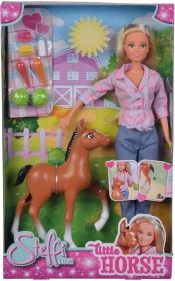 PoupĂ©e mannequin Steffi 29 cm avec un poulain. Le poulain possède une fonction amusante : il fait ses besoins. Plusieurs accessoires sont inclus pour prendre soin de l’animal : brosses, biberon, carottes, salades.