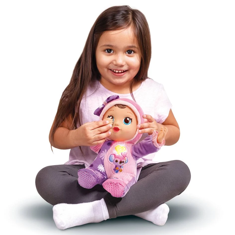 Little Love. Emma joue à cache-cache. De 1 à 6 ans. La poupée réagit quand on pose les mains sur ses yeux. 4 boutons interactifs : 1 bouton coeur pour découvrir les parties du corps et entendre battre son coeur. 1 bouton sur son ventre pour savoir si elle a faim. 2 boutons sur ses pieds pour déclencher mélodies, berceuses et apprendre à compter. Effets lumineux sur son petit bonnet. 5 chansons et 20 douces mélodies. Poupée en velours tout doux de 32 cm. Arrêt automatique.